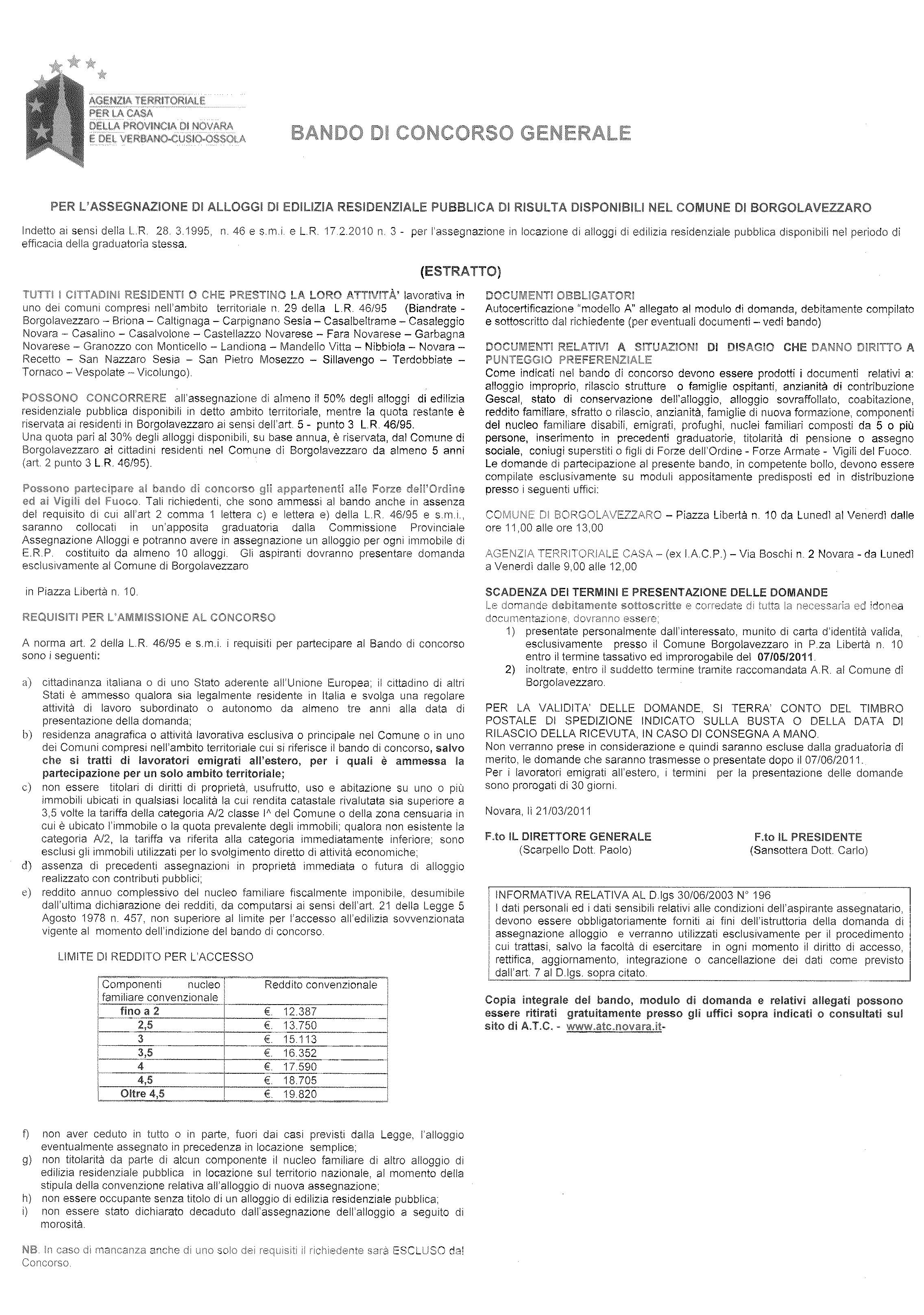 BANDO DI CONCORSO GENERALE PER L'ASSEGNAZIONE DI ALLOGGI DI EDILIZIA RESIDENZIALE PUBBLICA DI RISULTA DISPONIBILI NEL COMUNE DI BORGOLAVEZZARO