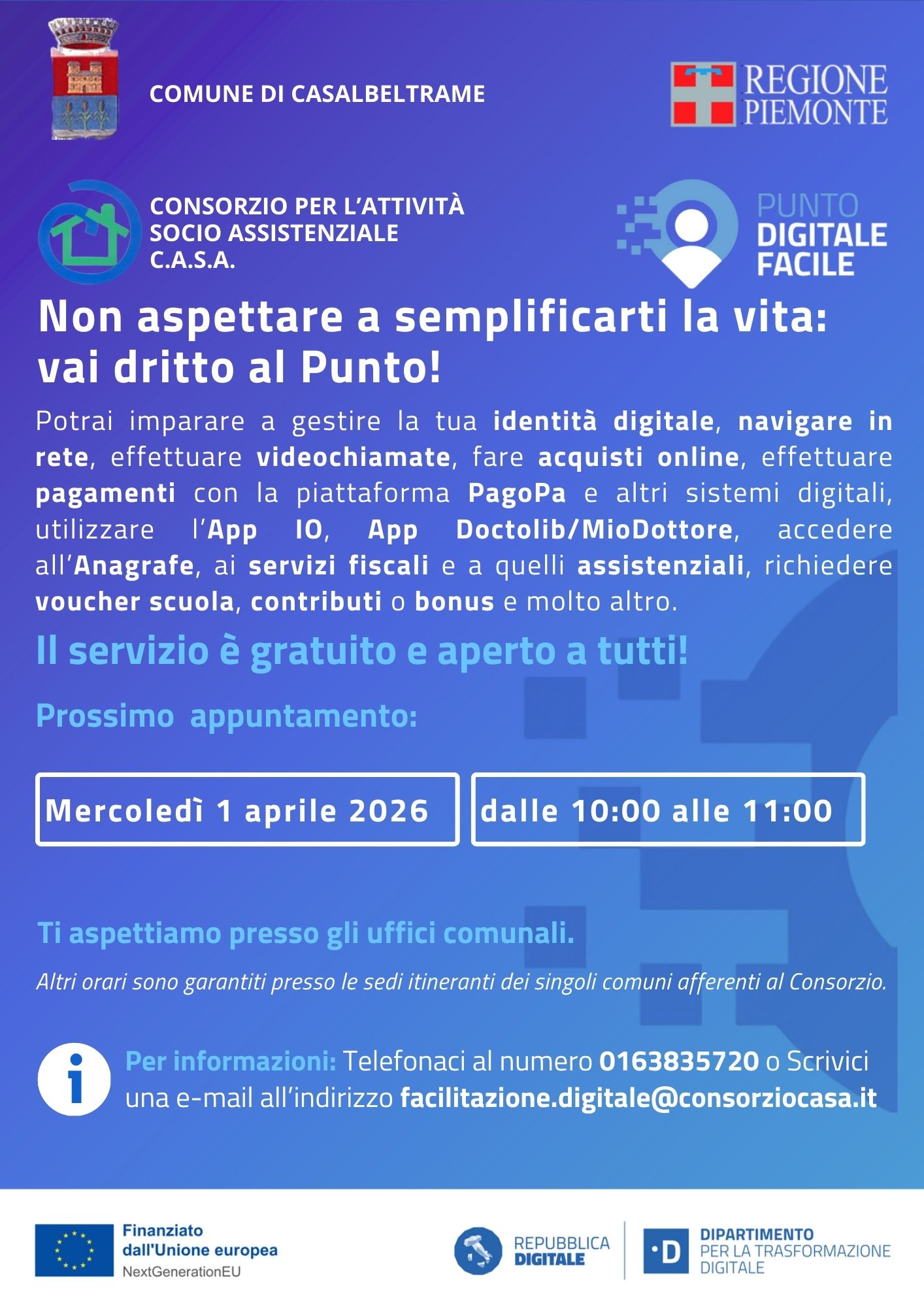 Il Comune di Casalbeltrame e il Consorzio C.A.S.A. vi aspettano presso gli uffici comunali per ricevere assistenza e formazione gratuita sull'utilizzo dei servizi digitali!